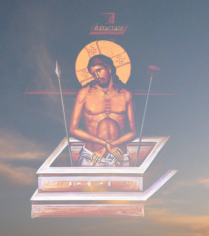 Проходящие же злословили Его, кивая головами своими и говоря: Разрушающий храм и в три дня Созидающий! спаси Себя Самого; если Ты Сын Божий, сойди с креста. Подобно и первосвященники с книжниками и старейшинами и фарисеями, насмехаясь, говорили: других спасал, а Себя Самого не может спасти; если Он Царь Израилев, пусть теперь сойдет с креста, и уверуем в Него; уповал на Бога; пусть теперь избавит Его, если Он угоден Ему. Ибо Он сказал: Я Божий Сын. Также и разбойники, распятые с Ним, поносили Его. От шестого же часа тьма была по всей земле до часа девятого; а около девятого часа возопил Иисус громким голосом: Или, Или! лама савахфани? то есть: Боже Мой, Боже Мой! для чего Ты Меня оставил? Некоторые из стоявших там, слыша это, говорили: Илию зовет Он. И тотчас побежал один из них, взял губку, наполнил уксусом и, наложив на трость, давал Ему пить; а другие говорили: постой, посмотрим, придет ли Илия спасти Его. Иисус же, опять возопив громким голосом, испустил дух. И вот, завеса в храме раздралась надвое, сверху донизу; и земля потряслась; и камни расселись; и гробы отверзлись; и многие тела усопших святых воскресли и, выйдя из гробов по воскресении Его, вошли во святый град и явились многим. Сотник же и те, которые с ним стерегли Иисуса, видя землетрясение и все бывшее, устрашились весьма и говорили: воистину Он был Сын Божий» (Матф.27:31-54).
