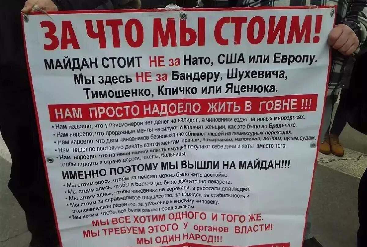 Из тех моих знакомых, которые тем или иным образом поддерживали Майдан нет никого, кто бы это делал за деньги. Люди приходили, помогали строить баррикады, приносили еду, одежду, средства гигиены, тратили на это свое время, силы… и СВОИ деньги. И таких людей были тысячи. Само собой, были вложения и от соросовских структур и от госдепа и от олигархов (преследовавших свои цели), но это никак не отменяет стихийности происходившего. То, как Майдан выглядел бы без выше изложенной «мотивации» ярко иллюстрируют фото первых протестов под стелой на Майдане во главе с Мустафой Найемом, стартовавших 21-го ноября 2013г. Причина — отказ Януковича от евроинтеграции. Это самое начало. Я его хорошо помню, так как мы с женой внимательно следили за развитием событий. Если загуглить, например: «первые дни Майдана», то поисковик вываливает кучу фото, но не первых дней. Это фото мне с трудом удалось найти. Здесь можно наблюдать доверие народа так называемой оппозиции (весьма пошатнувшееся со времен Майдана 2004), не смотря на «всенародную любовь» к Януковичу и его власти, а также то, чего бы стоили деньги, если бы американцы попытались просто раздать их людям за стояние на Майдане.