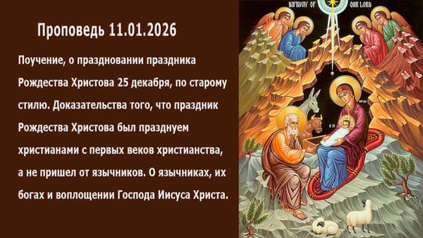 Поучение свт.Иоанна Златоуста, о праздновании праздника Рождества Христова 25 декабря, по старому стилю. Доказательства того, что праздник Рождества Христова был празднуем христианами с первых веков христианства, а не пришел от язычников. О тех, которые говорят, что душа частица Бога. О язычниках, их богах и воплощении Господа Иисуса Христа.