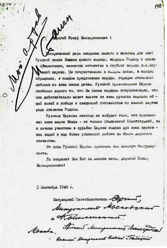 И теперь, ощущая на каждом шагу своей церковной и гражданской жизни благие результаты Вашего мудрого государственного руководства, мы не можем таить своих чувств, и от лица Русской Православной Церкви приносим Вам, дорогой Иосиф Виссарионович, в день Вашего семидесятилетия, глубокую признательность и. горячо приветствуя Вас с этим знаменательным для всех нас, любящих Вас, днем, молимся об укреплении Ваших сил и шлем Вам молитвенное пожелание многих лет жизни на радость и счастье нашей великой Родины, благословляя Ваш подвиг служения ей и сами вдохновляясь этим подвигом Вашим.