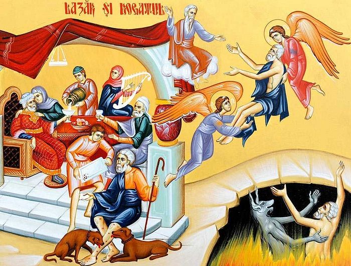 И сказал Господь притчу сию, / Некоторый человек был богат, одевался в порфиру и виссон и каждый день пиршествовал блистательно. Был также некоторый нищий, именем Лазарь, который лежал у ворот его в струпьях и желал напитаться крошками, падающими со стола богача, и псы, приходя, лизали струпья его. Умер нищий и отнесен был Ангелами на лоно Авраамово. Умер и богач, и похоронили его. И в аде, будучи в муках, он поднял глаза свои, увидел вдали Авраама и Лазаря на лоне его и, возопив, сказал: отче Аврааме! умилосердись надо мною и пошли Лазаря, чтобы омочил конец перста своего в воде и прохладил язык мой, ибо я мучаюсь в пламени сем. Но Авраам сказал: чадо! вспомни, что ты получил уже доброе твое в жизни твоей, а Лазарь — злое; ныне же он здесь утешается, а ты страдаешь; и сверх всего того между нами и вами утверждена великая пропасть, так что хотящие перейти отсюда к вам не могут, также и оттуда к нам не переходят. Тогда сказал он: так прошу тебя, отче, пошли его в дом отца моего, ибо у меня пять братьев; пусть он засвидетельствует им, чтобы и они не пришли в это место мучения. Авраам сказал ему: у них есть Моисей и пророки; пусть слушают их. Он же сказал: нет, отче Аврааме, но если кто из мертвых придет к ним, покаются. Тогда [Авраам] сказал ему: если Моисея и пророков не слушают, то если бы кто и из мертвых воскрес, не поверят. (Лук.16:19-31)