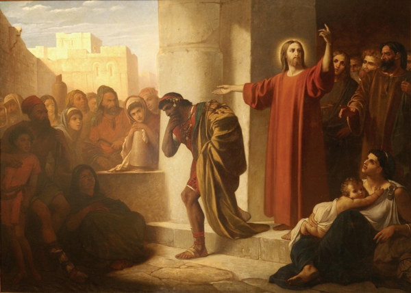 «И спросил Его некто из начальствующих: Учитель благий! что мне делать, чтобы наследовать жизнь вечную? Иисус сказал ему: что ты называешь Меня благим? никто не благ, как только один Бог; знаешь заповеди: не прелюбодействуй, не убивай, не кради, не лжесвидетельствуй, почитай отца твоего и матерь твою. Он же сказал: всё это сохранил я от юности моей. Услышав это, Иисус сказал ему: еще одного недостает тебе: всё, что имеешь, продай и раздай нищим, и будешь иметь сокровище на небесах, и приходи, следуй за Мною. Он же, услышав сие, опечалился, потому что был очень богат. Человек сей, по мнению некоторых, был какой-нибудь злой хитрец и искал, как бы уловить Иисуса в словах. Но вероятнее то, что он был сребролюбец, поскольку и Христос обличил его именно таковым. Да и евангелист Марк говорит, что некто, подбежав и пав на колена, спросил Иисуса, и, взглянув на него, Иисус полюбил его (Мк. 10, 17. 21). Итак, человек сей был любостяжателен. К Иисусу приходит он с желанием узнать о вечной жизни. Быть может, и в сем случае он руководился страстью к приобретению. Ибо никто так не желает долгой жизни, как человек любостяжательный. Итак, он думал, что Иисус укажет ему способ, по которому он будет вечно жить, владеть имуществом и таким образом наслаждаться. Но когда Господь сказал, что средство к достижению жизни вечной есть нестяжательность, то он, как бы упрекая себя за вопрос и Иисуса за ответ, отошел. Ибо он нуждался в вечной жизни, потому что имел богатства на много лет. А когда он должен отказаться от имения и жить, по-видимому, в бедности, то что ему за нужда в вечной жизни? — Приходит он к Господу, как просто к человеку и учителю. Поэтому Господь, чтобы показать, что к Нему не должно приходить как просто к человеку, сказал: «никто не благ, как только один Бог». Ты, — говорит, — назвал Меня «благим», к чему же еще прибавил: «учитель»? Кажется, ты принимаешь Меня за одного из многих. Если же так, то Я не благ: ибо из людей собственно никто не благ; благ только один Бог. Поэтому, если хочешь называть Меня благим, называй Меня благим как Бога, а не приходи ко Мне, как просто к человеку. Если же ты считаешь Меня одним из обыкновенных людей, то не называй Меня благим. Ибо один только Бог поистине благ, есть источник благости и начало самоблагостыни. А мы люди, если и бываем добры, то не сами по себе, но по участию в Его благости, имеем доброту смешанную и способную преклоняться на зло. — «Знаешь заповеди: не прелюбодействуй, не убивай, не кради, не лжесвидетельствуй» и прочие. Закон запрещает прежде то, во что мы удобнее впадаем, потом уже и то, во что впадают немногие и нечасто: например, прелюбодейство, поскольку оно есть огонь с внешней и внутренней стороны, убийство, поскольку гнев есть великий зверь; а воровство менее важно, и во лжесвидетельство можно нечасто впадать. Поэтому первые преступления запрещаются прежде, так как мы легко впадаем в оные, хотя в других отношениях они и более тяжки. А сии, то есть воровство и лжесвидетельство, Закон поставляет на втором месте, так как оные совершаются не часто и менее важны. Вслед за сими преступлениями Закон поставил грех против родителей. Ибо хотя грех этот и тяжек, но не часто случается, так как не часто и не много, но редко и мало оказывается таких зверообразных людей, чтоб решились оскорблять родителей. — Когда юноша сказал, что он сохранил все э