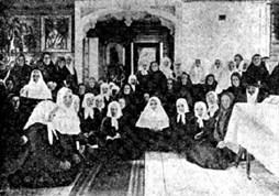 Инокини на собеседовании у м. Софии. Матушка София (слева в углу в белом) среди монахинь.