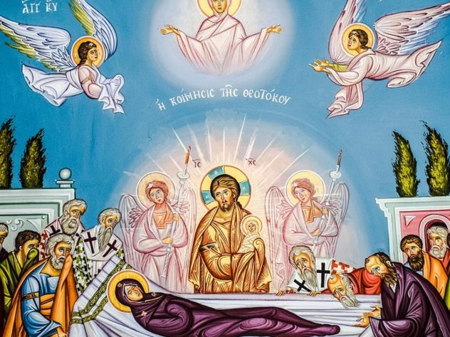 Тропарь. При рождении Христа, Ты девство сохранила, / и после смерти мира не оставила, Богородица; / Ты перешла к жизни, будучи Матерью Жизни, / и молитвами Твоими, избавляешь Ты от смерти души наши. Кондак. В молитвах неусыпающую Богородицу, / и в ходатайствах непоколебимую надежду, / гроб и смерть не удержали, / ибо Обитавший в Ее …