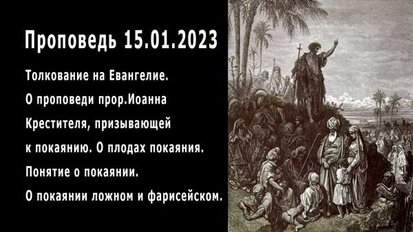 Толкование на Евангелие. О проповеди прор.Иоанна Крестителя, призывающей к покаянию. О плодах покаяния и как они познаются. Понятие о покаянии современное и истинное. О ложном покаянии, заменяющем одну страсть на другую. О покаянии фарисейском. Обращение к Новому году.