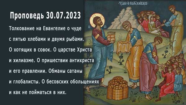 Толкование на Евангелие о чуде с пятью хлебами и двумя рыбами. Христос показал, что Он Творец. Параллель между вышедшими из Египта и из Совка. Что будет со всеми хотящими вернуться в Совок? Об обществе благоденствия в будущем. Христа хотели сделать земным царем, о царстве Христа. О борьбе с глобалистами, и об ожидающих тысячелетнего царства Христа на земле (хилиазм). О протестантах находящихся в прелести душевного сладострастия. О пришествии антихриста, и как он будет выдавать себя за Иисуса Христа. О мессианских евреях, и христианах, которые обольстятся антихристом. Обман сатаны с глобалистами и антихристом. Как дьявол обманет и обольстит всех одержимых самомнением и надеющихся на свой ум. Бесы имеют власть над людьми через страсти. Как не пойматься в сети бесовские, и о пути победы над сатаной? Как примут антихриста? Ветхозаветный иудаизм и христианство. Как появился новозаветный талмудический иудаизм? О появлении масонов, марксистов, коммунистов, мирового совка и антихриста. Как сатана использует глобалистов и всех служащих им. О получении еды только от правительства и антихриста. О правлении антихриста, ожесточении в нераскаянности и отчаянии. О покаянии малого остатка под конец, и Втором пришествии Христа. Источник истины и добра — Бог. Сатана — вор, лжец.