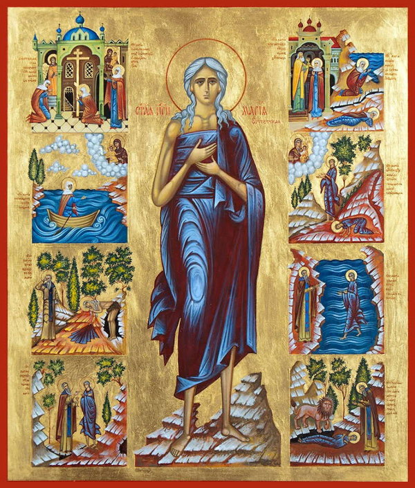Послушаем, как сама преподобная повествовала об этом святому старцу Зосиме. «Зосима спросил: “Сколько же лет, госпожа, прошло, как ты водворилась в этой пустыни?” “Я думаю, – отвечала она, – протекло 47 лет, как я оставила святой город”. “Что же, – спросил Зосима, – ты находишь себе на пищу?” “Перешедши Иордан, – сказала святая, – я имела два с половиной хлеба; они понемногу высохли, как бы окаменели, и их я вкушала понемногу несколько лет”. Зосима сказал: “Как ты могла благополучно прожить столько времени, и никакой соблазн не смутил тебя?” “Я боюсь отвечать на твой вопрос, отец Зосима: когда я буду вспоминать о тех бедах, какие я претерпела от мучивших меня мыслей, я боюсь, что они снова овладеют мною”. “Ничего, госпожа, – сказал Зосима, – не опускай в своем рассказе, я потому и спросил тебя, чтобы знать все подробности твоей жизни”. Тогда она сказала: “Поверь мне, отец Зосима, что 17 лет прожила я в этой пустыне, борясь со своими безумными страстями, как с лютыми зверями. Когда я принималась за пищу, я мечтала о мясе и вине, какие ела в Египте; мне хотелось выпить любимого мною вина. Будучи в миру, много пила я вина, а здесь не имела и воды; я изнывала от жажды и страшно мучилась. Иногда у меня являлось очень смущавшее меня желание петь блудные песни, к которым я привыкла. Тогда я проливала слезы, била себя в грудь и вспоминала обеты, данные мною при удалении в пустыню. Тогда я мысленно становилась перед иконою поручительницы моей, Пречистой Богородицы и с плачем умоляла отогнать от меня мысли, смущавшие мою душу. Долго я так плакала, крепко ударяя себя в грудь, и наконец как бы свет разливался вокруг меня, и я успокаивалась от волнений. Как признаться мне, отец, в блудных вожделениях, овладевавших мною? Прости, отец. Огонь страсти загорался во мне и опалял меня, понуждая к похоти. Когда на меня находил такой соблазн, то я повергалась на землю и обливалась слезами, представляя себе, что перед мною стоит Сама моя поручительница, осуждает мое преступление и грозит за него тяжелыми мучениями. Поверженная на землю я не вставала день и ночь, пока тот свет не озарял меня и не отгонял смущавшие меня мысли. Тогда я возводила очи к поручительнице своей, горячо прося помощи моим страданиям в пустыне – и действительно, Она мне давала помощь и руководство в покаянии. Так провела я 17 лет в постоянных мучениях. А после, и до сего времени, Богородица во всем – моя помощница и руководительница”. Тогда Зосима спросил: “Не было ли тебе нужды в пище и в одежде?” Святая отвечала: “Окончив хлебы, через семнадцать лет, я питалась растениями; одежда, какая была на мне при переходе через Иордан, истлела от ветхости, и я много страдала, изнемогая летом от зноя, трясясь зимой от холода; так что много раз я, как бездыханная, падала на землю и так долго лежала, претерпевая многочисленные телесные и душевные невзгоды. Но с того времени и до сего дня, сила Божия во всем преобразила мою грешную душу и мое смиренное тело, и я только вспоминаю о прежних лишениях, находя для себя неистощимую пищу в надежде на спасение: питаюсь и покрываюсь я всесильным словом Божиим, ибо «не хлебом одним будет жить человек!» (Мф.4:4). И совлекшиеся греховного одеяния не имеют убежища, укрываясь среди каменных расселин (ср. Иов.24:8; Евр.11:38)”. Услыхав, что святая вспоминает слова Священного Писания из Моисе